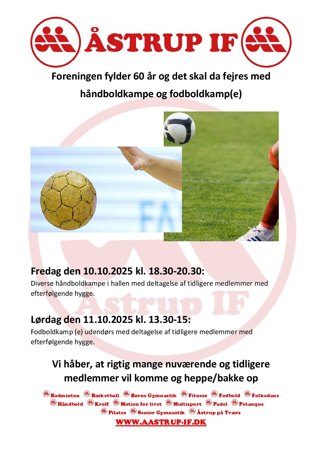 Jubilæumskampe fredag 10.10. og lørdag 11.10.2025 okt 9, 2025 | Arkiv, Fodbold, Håndbold, Nyheds-arkiv Kære alle. I forbindelse med at foreningen bliver 60 år, er der arrangeret både håndbold- og fodboldkampe. Så kom og bak op og heppe på yndlingsholdet:-) Se nærmere i opslaget.