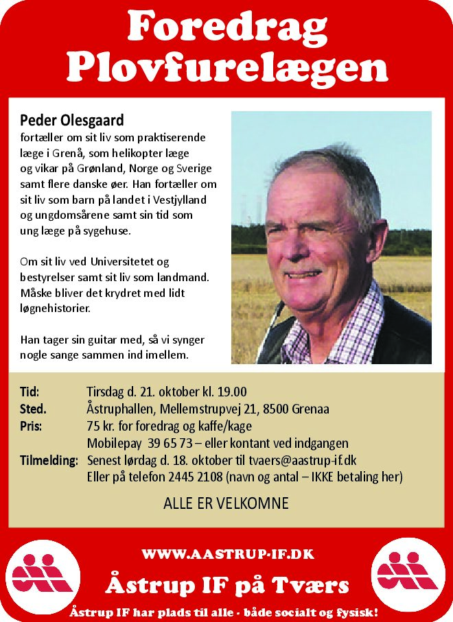 Plovfurelægen – Den 21.10.2025 kl. 19.00 okt 15, 2025 | Åstrup på Tværs, Nyheder, Nyheds-arkiv Kom og hør Peder Olesgaard fortælle sin livshistorie.