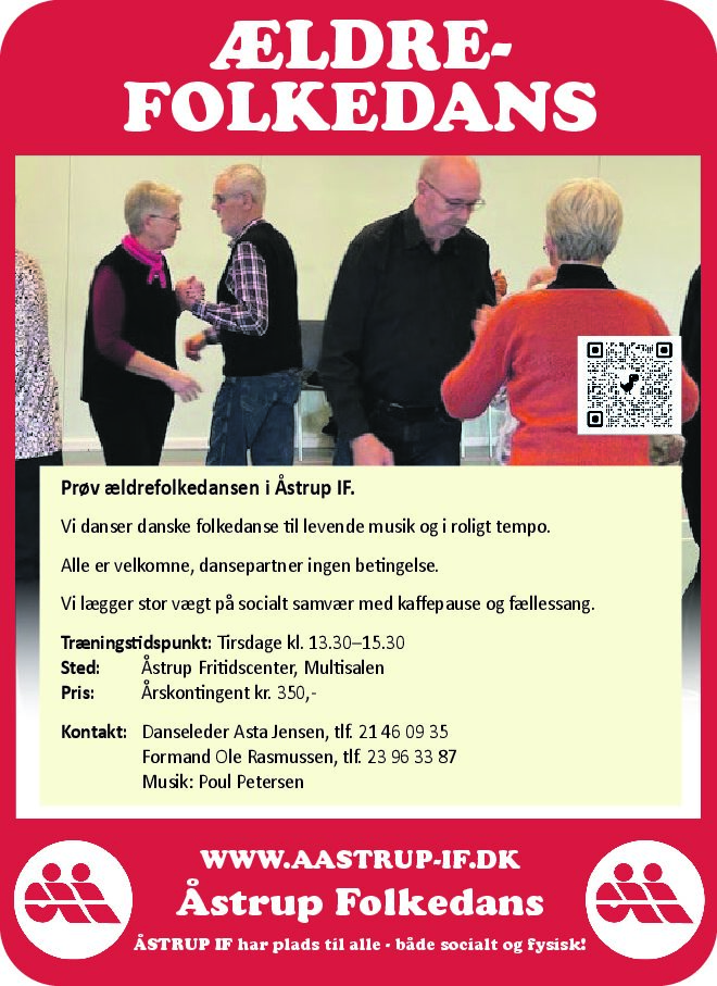 Ældrefolkedans okt 23, 2025 | Folkedans, Nyheder, Nyheds-arkiv Vi danser fortsat folkedans i Åstrup IF. Så kom og deltag. Vi har det sjovt. Se opslaget for videre information.