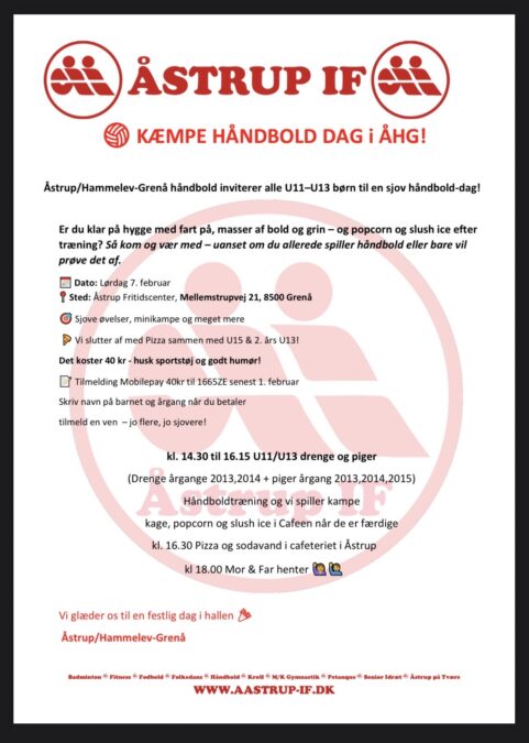 Kæmpe Håndbold dag, lørdag den 07.02.2026 nov 25, 2025 | Arkiv, Håndbold, Nyheder, Nyheds-arkiv Vi afholder Håndbold dag d. 7/2 både for vores medlemmer i ÅHG (U11/U13) men også for børn, der er nysgerrige på håndbold. Så hvis det lige er dig, så skynd dig at tilmeld dig:-)