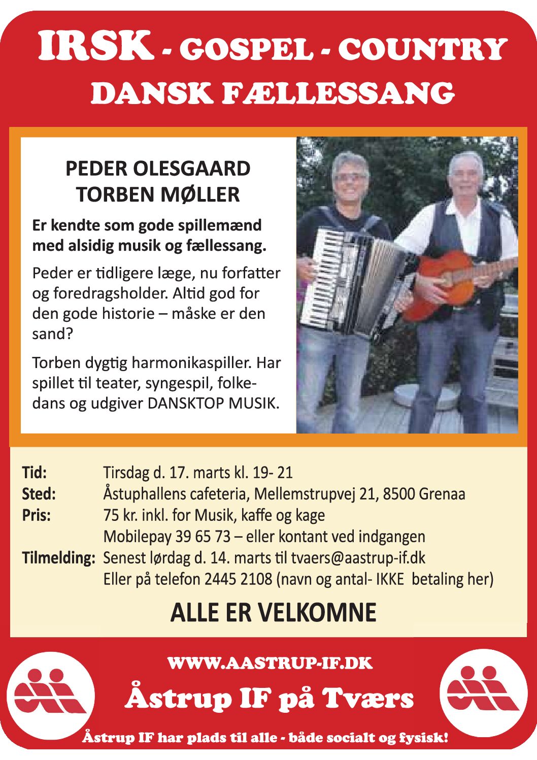 Irsk aften Tirsdag den 17.03.2026 kl. 19-21 feb 12, 2026 | Arkiv, Åstrup på Tværs, Billede arkiv, Nyheder, Nyheds-arkiv Kom og hør vores lokalkendte spillemænd spille irsk, gospel og country og få en hyggelig aften. Vel mødt.